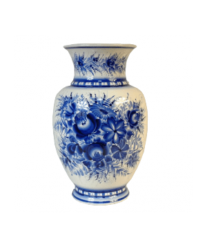 Традиционная тематика рисунка может содержать изображения цветов, бутонов, злаков, ягод, травы, ветвей, птиц, а также орнамент –сетки-гребенки, капельки, отводки и другие. Гжельская роспись придает изделию особую воздушность и легкость. Сегодня эта ваза может украсить интерьер художественного уголка детского сада.