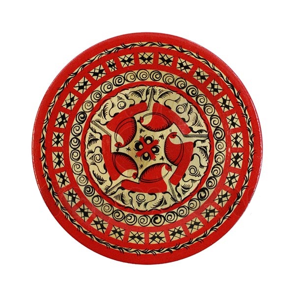 Декоративная тарелка выполнена в технике Мезенской росписи, которая сложилась к концу XIX века в низовьях реки Мезень. Данная роспись характерна геометричностью фигур-символов – диски, ромбы, кресты и другие фигуры, которые имели особое значение для северных славян. Чаще всего это символы огня, неба, плодородия, а так же изображения птиц, коней и оленей.