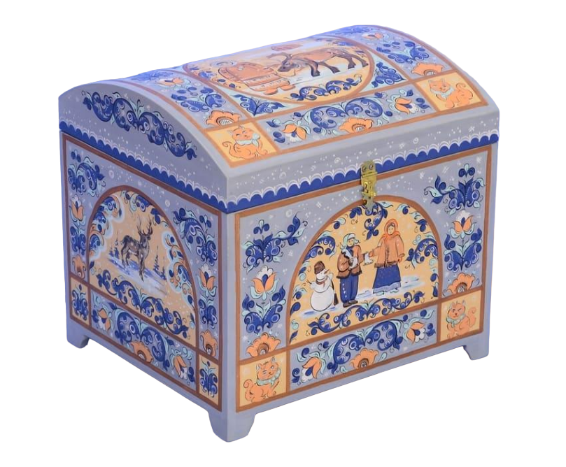 Изготовлен из берёзовой фанеры, расписан гуашевыми и темперными красками, покрыт матовым лаком. Фурнитура - латунь.