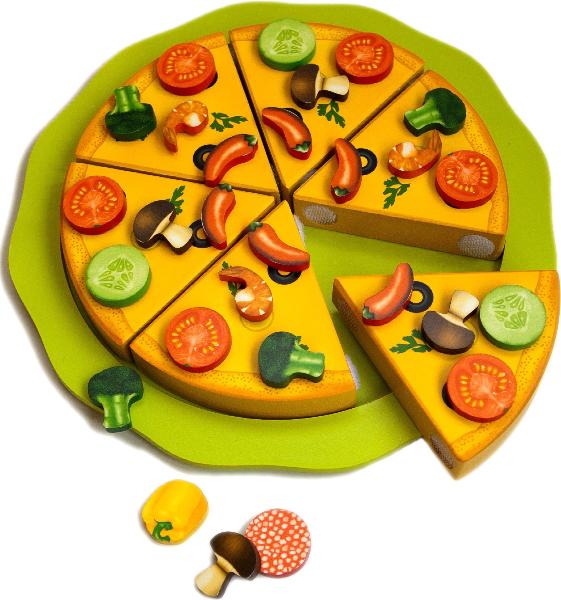 Игрушка представляет собой набор элементов, из которых можно составить пиццу на любой вкус.
