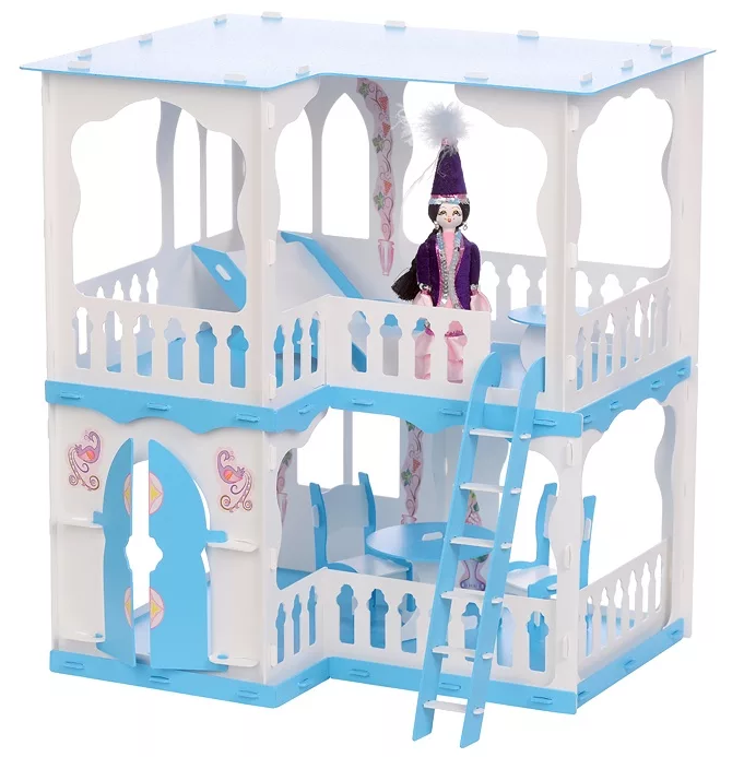 Комплектность: детали для постройки домика, лесенка, шезлонг, столик для шезлонга, стол, 2 стула, наклейки. Размеры домика: 37.5х50х55 см. Домик подходит для кукол высотой до 16 см. Материал: пластик. Возраст: от 3 лет.