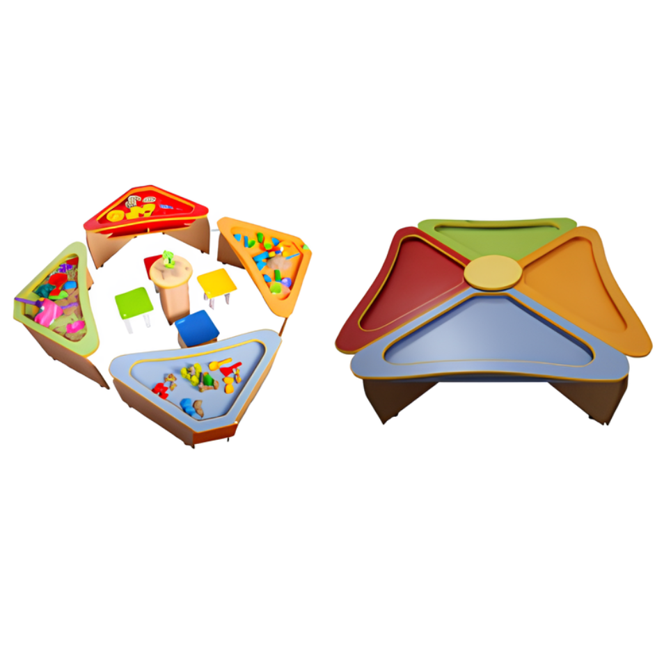 Красочный детский комплекс хорошо впишется в интерьер кабинета, не займет много места и, в то же время, позволит провести занятие для небольшой группы детей в 2-4 человека и даже больше. Каждая столешница имеет съемную крышку, и если она закрыта, стол легко превращается в письменный.
