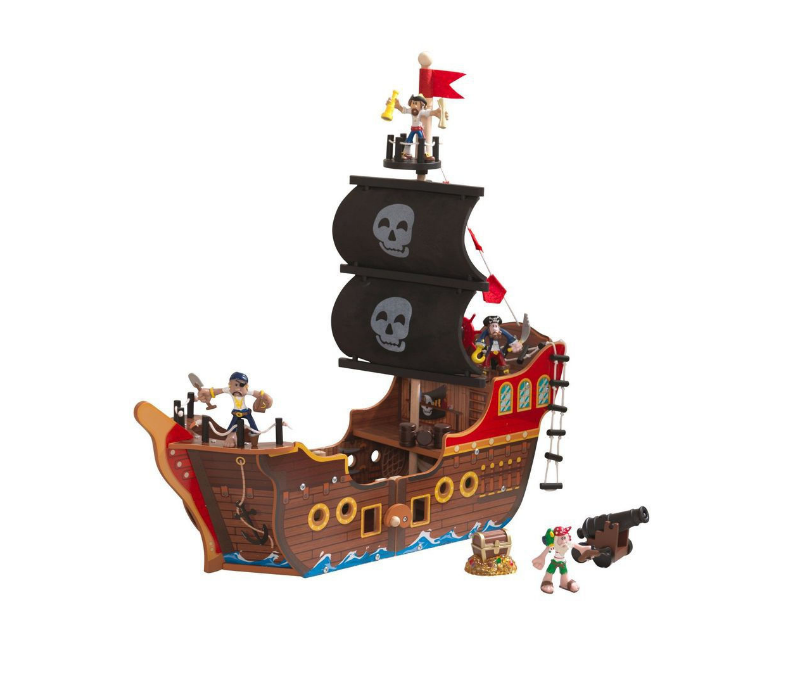 Пиратский корабль может раздвигаться, он имеет два больших черных паруса с изображением черепов, штурвал, мачту с наблюдательным пунктом и флагом, а также груз.