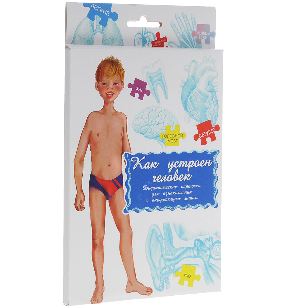 Дидактические карточки познакомят малышей с анатомией человека, строением тела и внутренними органами: сердцем, желудком, мозгом и другими.